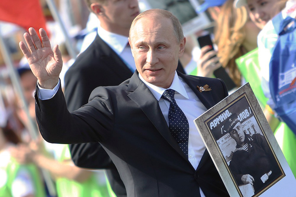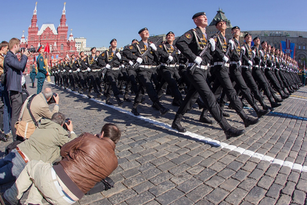 После объезда оркестр традиционно исполняет мелодию патриотической песни "Славься" из оперы "Иван Сусанин" Михаила Глинки (звучала на историческом параде 24 июня 1945 года). Министр обороны направляется к трибунам, установленным параллельно Кремлевской стене близ Мавзолея В. И. Ленина (на время парада усыпальницу закрывают декоративными щитами), и докладывает о готовности войск президенту России (с 2012 года - Владимир Путин), который является Верховным главнокомандующим Вооруженными силами РФ. Президент произносит торжественную речь, после чего объявляет минуту молчания в память обо всех погибших в Великой Отечественной войне. Рядом с президентом РФ на трибунах находятся гости - ветераны войны из России, стран ближнего и дальнего зарубежья; представители военного и политического руководства страны и др.