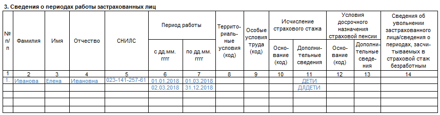 Заполните по сотруднице две строки в разделе 3. Первой строкой отразите период, когда она находилась в отпуске: с 01.01.2018 по 19.08.2018. В графе 11 поставьте код «ДЕТИ». Второй строкой отразите период, когда она стала работать неполный день, – с 20.08.2018 по 31.12.2018. Код «ДЕТИ» уже не ставьте |