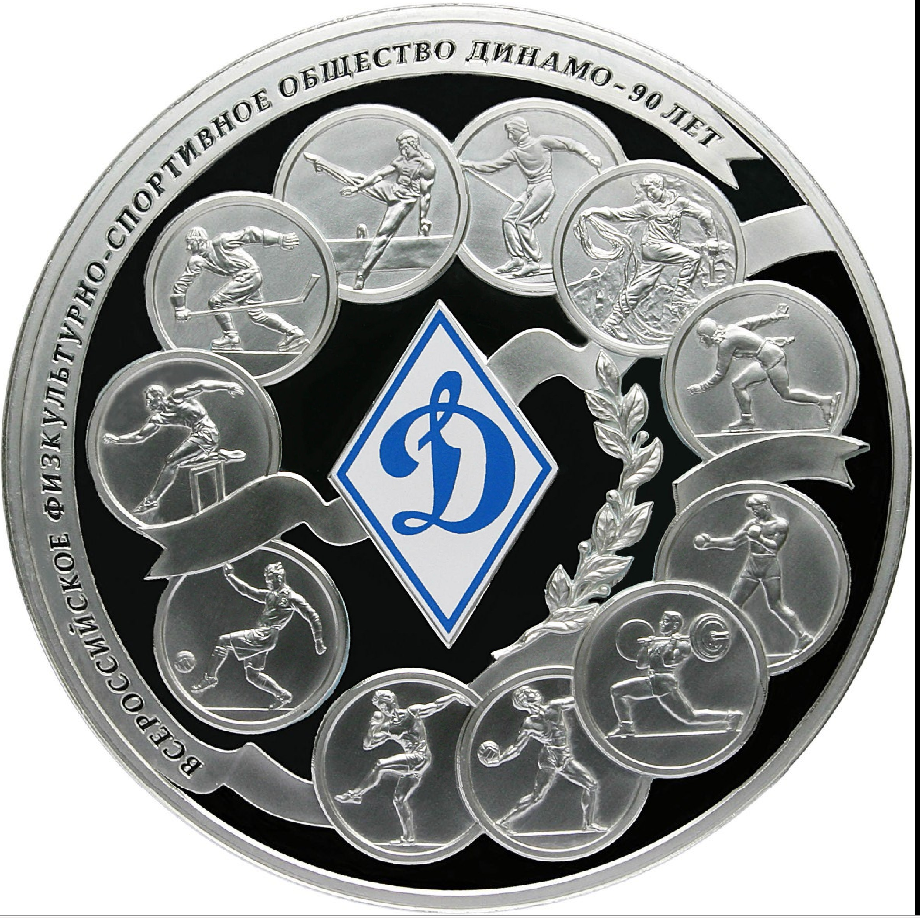 На зеркальном поле диска в центре - эмблема общества "Динамо", исполненная в синем цвете, лента и лавровая ветвь в окружении одиннадцати круглых медальонов с изображениями спортсменов, слева и вверху на светлой полосе вдоль канта - надпись: "ВСЕРОССИЙСКОЕ ФИЗКУЛЬТУРНО-СПОРТИВНОЕ ОБЩЕСТВО ДИНАМО-90 ЛЕТ".