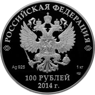 Аверс: в центре зеркального поля диска, в круге, образованном сплошной концентрической линией – эмблема Банка России (двуглавый орел с опущенными крыльями, под ним надпись полукругом "БАНК РОССИИ"), обрамленная кругом из точек и надписями по кругу – вверху: "СТО РУБЛЕЙ", внизу: слева – обозначения драгоценного металла и пробы сплава, в центре – год выпуска "2014 г.", справа – содержание химически чистого металла и товарный знак монетного двора, на поле вокруг эмблемы – расположенные по спирали фамилии
